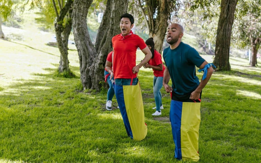 Players hop into potato sacks and race to a finish line. But remember, these sacks are bulkier and harder to navigate, adding an extra layer of challenge.
