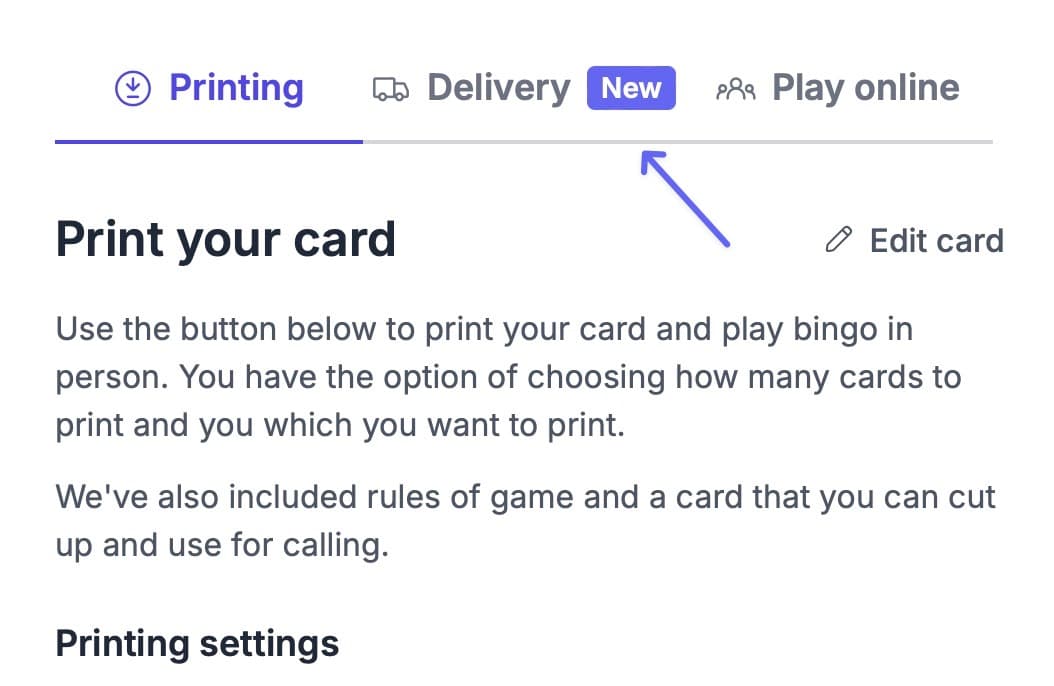 After you've signed up and created your bingo cards, you'll be taken to the print page as usual. However, you will now see a delivery tab at the top of the page. Select that and then continue with the guide below.
